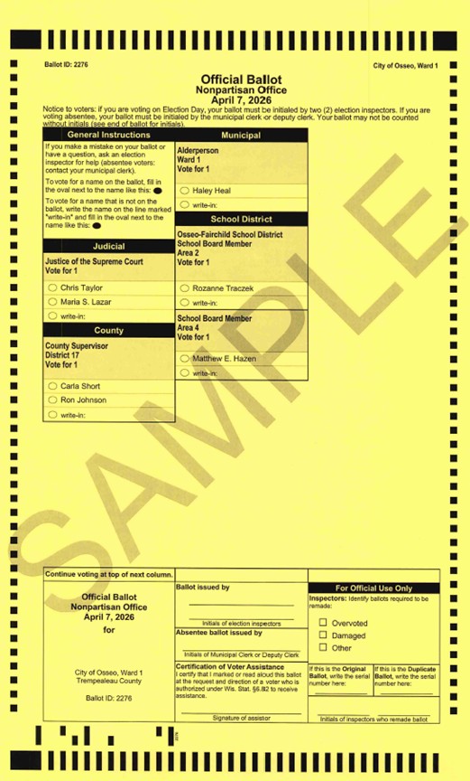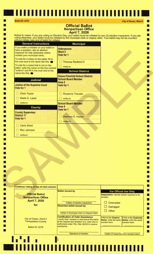 Elections are held for all Wards (1, 2, 3) in the City of Osseo at the following polling place: